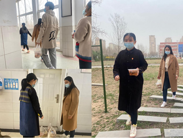 按照疫情防控要求,护理学院有16个学生宿舍进行集中隔离,为解决隔离学生就餐困难的问题,护理学院第一、四学生党支部、学生工作办公室师生组建志愿服务小组,点对点为隔离学生进行非接触送饭。保障了学生隔离期间的生活需求,让隔离学生吃上热乎饭、暖心饭。