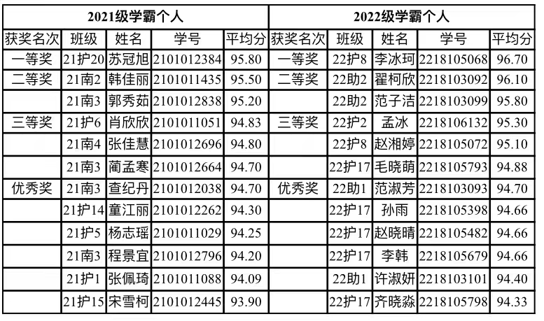 为倡导踏实严谨的优良学风,培养同学们良好的学习习惯,切实提高自主学习能力和互学互助精神,同时也为激发同学们的积极性和主动性,促进综合素质的全面提高。护理学院于2023年3月举办第三届“学霸评选”活动。根据2022-2023学年第一学期成绩平均分排名,最终评选出学霸个人24名、学霸宿舍24个及学霸班级6个。现将评选结果公示如下: