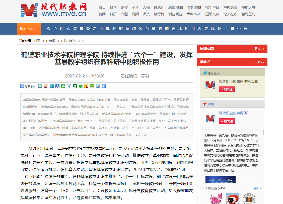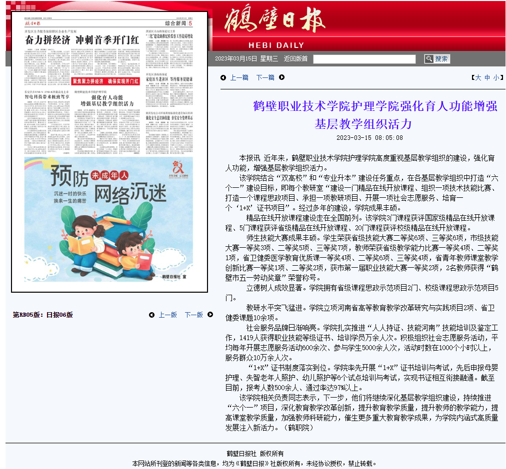 为充分发挥基层教学组织在教科研中的积极作用,多年来,护理学院在各教研室深入推进“六个一”项目建设。近日,我院报送的专题《鹤壁职业技术学院护理学院强化育人功能增强基层教学组织活力》、《鹤壁职业技术学院护理学院持续推进“六个一”建设,发挥基层教学组织在教科研中的积极作用》,分别被鹤壁日报、现代职教网采纳报道。