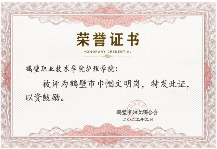 2023年3月,护理学院荣获“鹤壁市巾帼文明岗”荣誉称号、申洁同志荣获“鹤壁市三八红旗手”荣誉称号。我院一直以来高度重视发挥巾帼力量,始终坚持“立德树人,培根铸魂”育人理念,立足本职,爱岗敬业,潜心治学,行为世范。