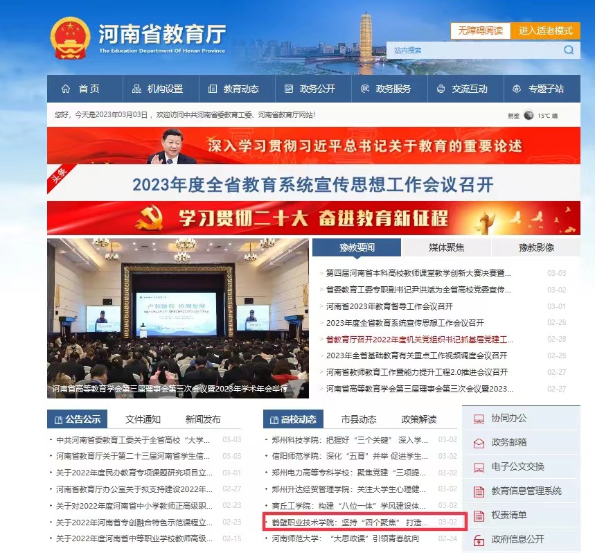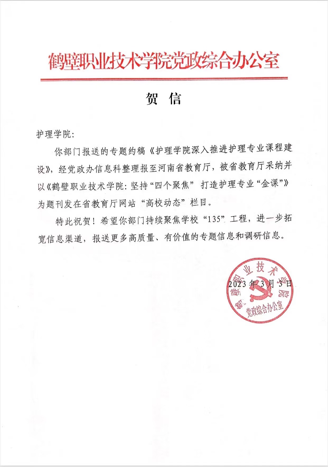 近年来,我院立足学校实际,深入推进“三教”改革,坚持“四个聚焦”,积极打造护理专业“金课”。2023年3月2日,我院报送的专题约稿《护理学院深入推进护理专业课程建设》,被省教育厅采纳并以《鹤壁职业技术学院: 坚持“四个聚焦”打造护理专业“金课”》为题刊发在省教育厅网站“高校动态”栏目。