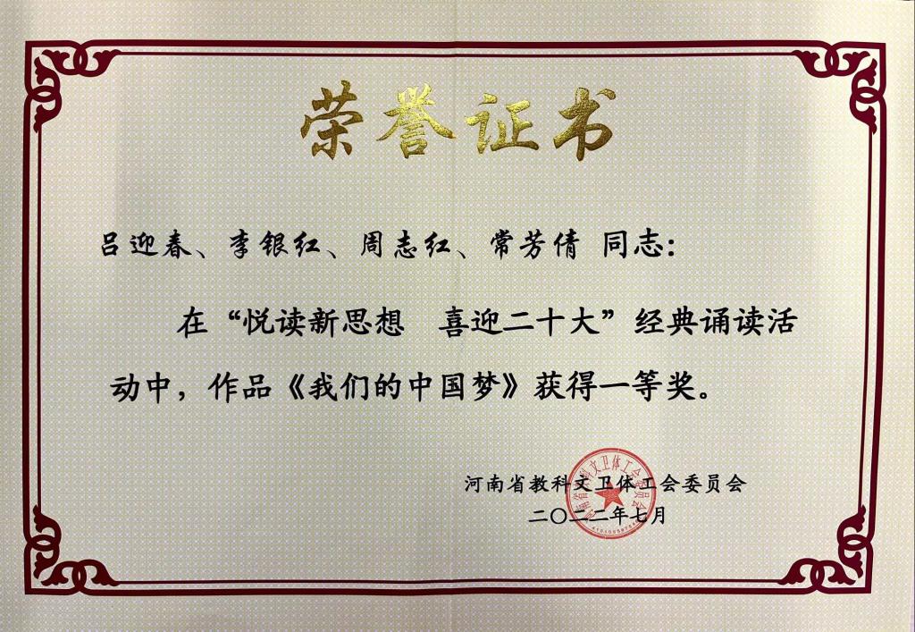 护理学院积极组织教师参与河南省教科文卫体工会委员会组织的“悦读新思想 喜迎二十大”经典诵读活动,经过层层推选,由吕迎春、李银红、周志红、常芳倩四位老师合诵的作品《我的中国梦》代表学校参赛,并荣获一等奖。护理学院将以本次活动为契机,继续以党的二十大精神为引领,不断创新学习宣传贯彻新模式,奋力书写学院各项事业发展新篇章。