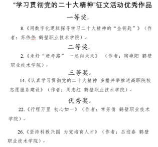 护理学院组织教师积极参与鹤壁市社科联举办的“贯彻党的二十大精神征文活动”,在此次征文活动中共有5名教师获奖,其中一等奖1项,二等奖1项,三等奖1项,优秀奖2项。活动的积极参与和荣誉的获得,不仅拓宽了大家二十大精神学习广度、增强了学习深度,也必将激励大家以党的二十大精神为引领,奋力推动学院各项事业再上新台阶。