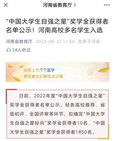近日,由共青团中央、全国学联指导,中国青年报社、新东方教育科技集团、中国青年创业就业基金会联合举办2022年度“中国大学生自强之星”奖学金评选结果揭晓,护理学院2020级学生张宁荣获2022年度“中国大学生自强之星” 奖学金。