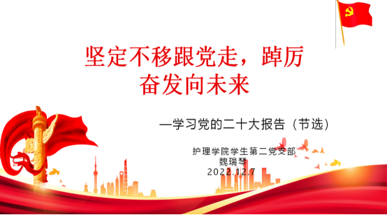 新目标激荡人心,新征程催人奋进。2022年12月7日下午,护理学院学生第二党支部党员教师魏瑞琴以“坚定不移跟党走,踔厉奋发向未来”为主题为护理学院急救小分队成员及南丁格尔志愿服务协会部分成员进行线上宣讲党的二十大会议精神。
