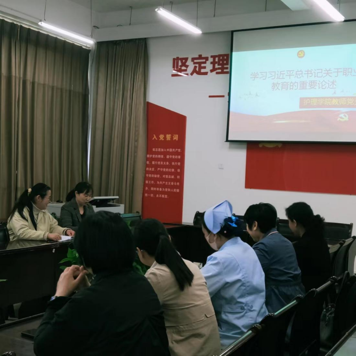 为认真落实全面深入学习贯彻党的二十大精神,4月26日,护理学院教师党支部传达学习习近平总书记关于职业教育的重要论述。宣传委员吕迎春带领大家重点学习了“两会”期间习近平总书记关于职业教育的重要论述。重点强调教育要坚持育人的根本在于立德,善用“大思政课”铸魂育人,以中华优秀传统文化教育涵养历史自信、文化自信,加快发展素质教育,培养德智体美劳全面发展的社会主义建设者和接班人。教师们纷纷表示要以时不我待的精神状态砥砺奋进,深化高等教育综合改革,做到真抓实干,不断开创新时代教育工作新局面。