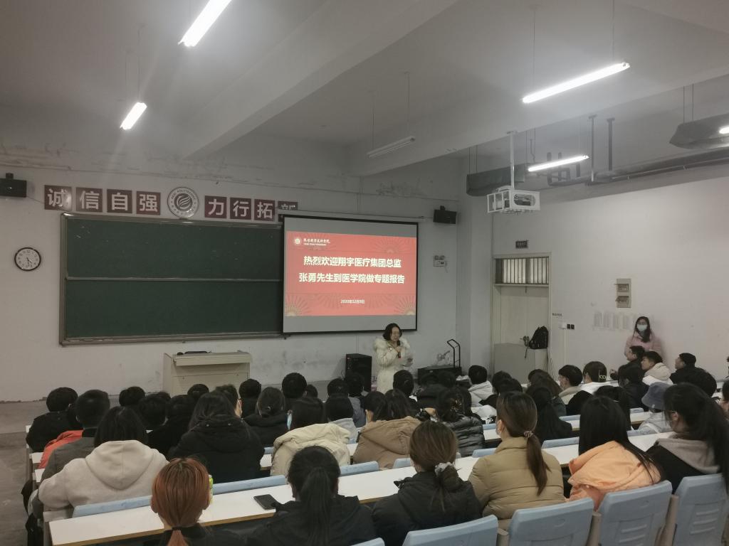 12月9日,医学院康复治疗技术专业校企合作“翔宇订单班”宣讲会在樱花园校区自强2号楼3115教室举行。翔宇医疗设备股份有限公司品牌总监张勇、人力资源部部长张阳、医学院副院长刘海燕、辅导员王保军、李玲玉及2019级康复治疗技术专业250余名学生参加了宣讲会。