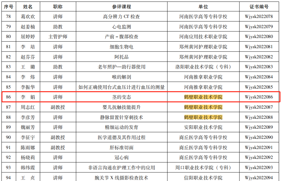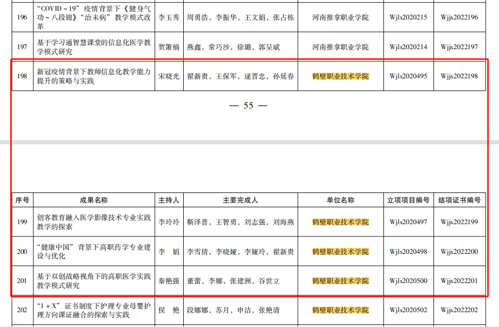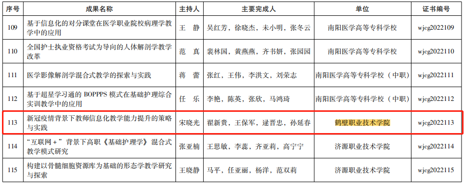 近日,河南省卫生健康委下发了《河南省卫生健康委关于公布2022年河南省医学教育研究项目立项教学成果和优质课评选结果的通知》(豫卫科教函〔2022〕8号),医学院宋晓光、李娟、李玲玲、秦艳强四位老师主持的医学教育研究项目顺利结项,其中宋晓光老师主持的《新冠疫情背景下教师信息化教学能力提升的策略与实践》项目获得2022年度河南省医学教育优秀教学成果奖三等奖。李娟老师讲授的《茎的变态》获医学教育优质课三等奖。