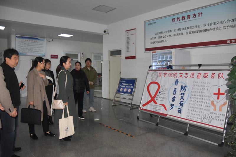 窦萍参观了医学院艾滋病检测点实验室,详细了解检测点的运行和管理情况,听取防艾志愿者协会关于《高校防艾基金项目》开展情况的汇报,查验相关材料,并就高校防艾工作现状和趋势与参会人员进行了细致交流,肯定了学院依托医学专业开展艾防工作的思路和办法,提出了具体指导意见。