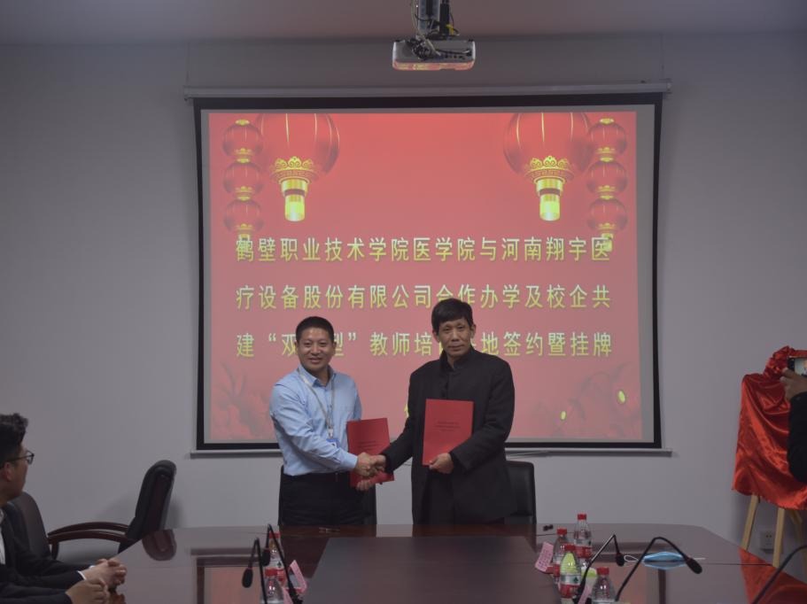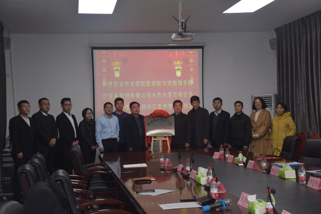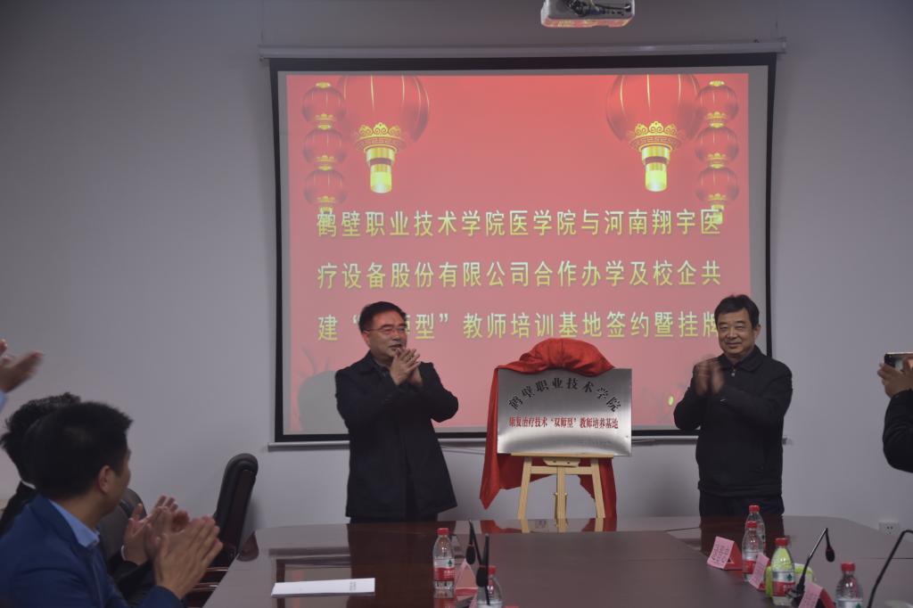 医学院院长杨尚玉与翔宇医疗人力资源总监朱建岭代表校企双方签约《鹤壁职业技术学院医学院与河南翔宇医疗设备有限公司合作办学协议书》,共同为康复治疗技术专业“双师型”教师培养基地揭牌。