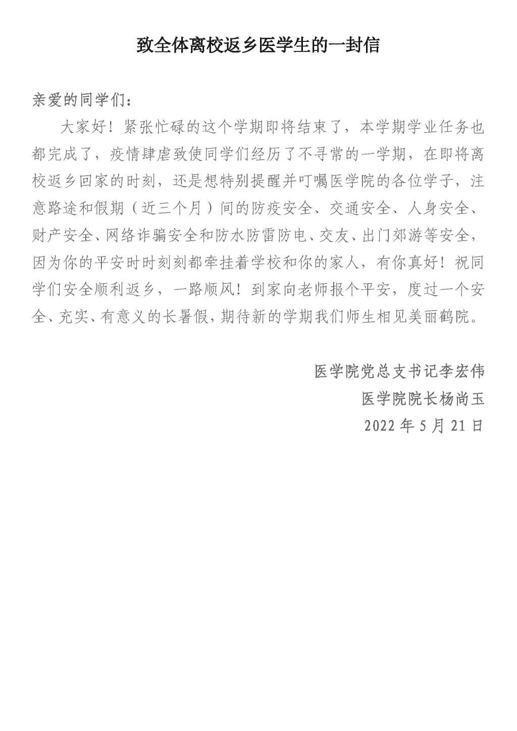 2022年5月21日(星期六),医学院向全体医学生发送了“致全体医学生的一封信”, 叮嘱学生离校返乡要做好疫情防护,暑期出行要注意安全,平安、愉快地度过美好假期。