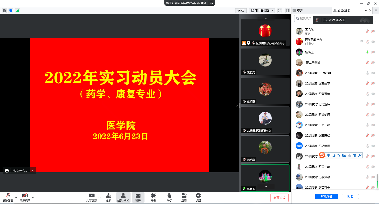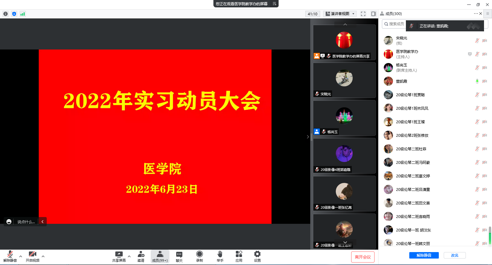 为确保2020级学生实习工作顺利开展,6月23日下午,医学院召开2022年实习动员大会。医学院院长杨尚玉、副院长徐明录、党总支副书记董凯霞、教学办主任宋晓光及2020级辅导员、全体学生共同参加。会议以线上腾讯会议形式线上进行。