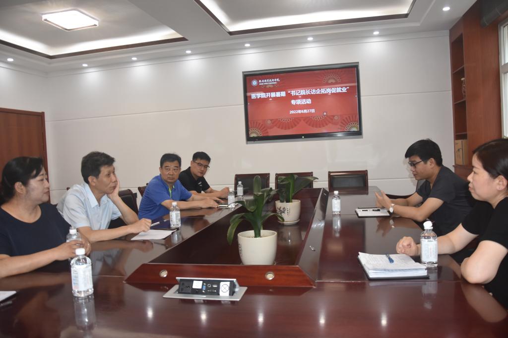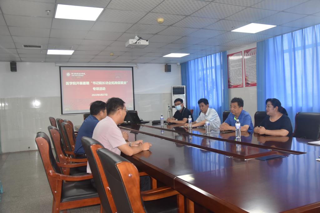 近期,为深入贯彻落实党中央、国务院关于高校毕业生就业工作的决策部署,扎实开展书记院长访企拓岗促就业专项行动,同时按照河南省教育厅就业处指示精神,结合学校创新创业与就业服务处安排,6月27至7月14日,医学院领导带队赴鹤壁市及周边地市企事业单位开展走访调研,就进一步拓宽毕业生就业渠道,深化校企合作进行深入交流。医学院党总支书记李宏伟、院长杨尚玉、副书记董凯霞、团学办主任王保军和分管就业工作的高燕远老师参加了走访调研活动。