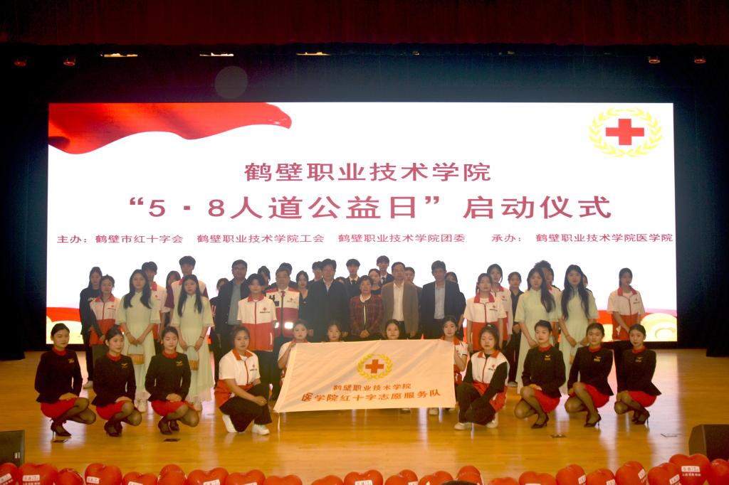 为弘扬中华民族乐善好施、行善积德的美好传统文化,传递社会正能量。2023年5月7日鹤壁职业技术学院医学院红十字志愿服务队联合学校工会、团委在诚信礼堂隆重举行“5.8人道公益日”启动仪式。鹤壁市红十字会党组书记、常务副会长张红霞、鹤壁职业技术学院党委副书记赵勇、工会副主席李宏伟、团委副书记(人文教育学院党总支书记)高忠波出席启动仪式,参加本次会议的还有各二级部门、二级学院分工会主席、团总支书记,学生志愿者代表,新闻媒体、记者朋友等,仪式由医学院党总支书记赵成志主持。