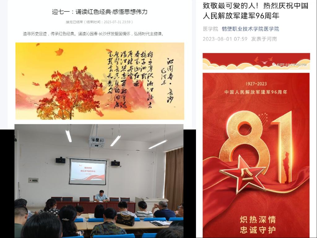 一、医路向党,传承红色基因。医学院开展了迎七一、庆八一主题党日系列活动。党总支书记赵成志以“锚定目标 埋头苦干奋勇争先”为主题向全体教职员工讲授了一堂生动的党课,各党支部进行 “红色七月”党课学习。假期期间,医学院党总支书记赵成志带领部分辅导员前往新乡获嘉县、辉县、卫辉等多名学生家庭中进行实地走访慰问,落实国家资助政策、强化资助育人效果。开学前医学院全体教职工开展培训并赴刘邓大军石林会议旧址开展“学党史·跟党走”师德主题教育实践活动。全体师生从红色基因中不断汲取继续前行的精神力量,砥砺奋进前行。