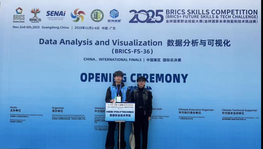 近日,2025金砖国家职业技能大赛“数据分析与可视化”赛项中国赛区国际总决赛在广东建设职业技术学院清远校区举行。大数据学院学生王子良凭借过硬的专业功底脱颖而出,历经南北区域选拔赛层层筛选,与中国、俄罗斯、印度、南非、新加坡等 9 国 137 支参赛队同台竞技,最终斩获全国总决赛三等奖。