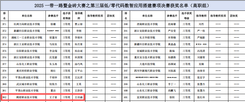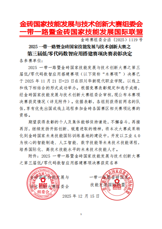 近日,在2025一带一路暨金砖国家技能发展与技术创新大赛之第三届低/零代码数智应用搭建赛项全国总决赛中,我校大数据学院参赛学生表现优异,荣获国家三等奖5项。