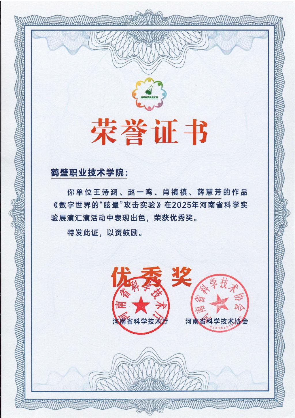 近日,2025年河南省科学实验展演汇演活动圆满落幕,大数据学院教师团队首次参赛即创佳绩。由王诗涵、赵一鸣、肖禛禛、薛慧芳四位教师共同完成的实验作品《数字世界的眩晕攻击》荣获优秀奖,实现了学校在该项赛事中奖项“零的突破”。