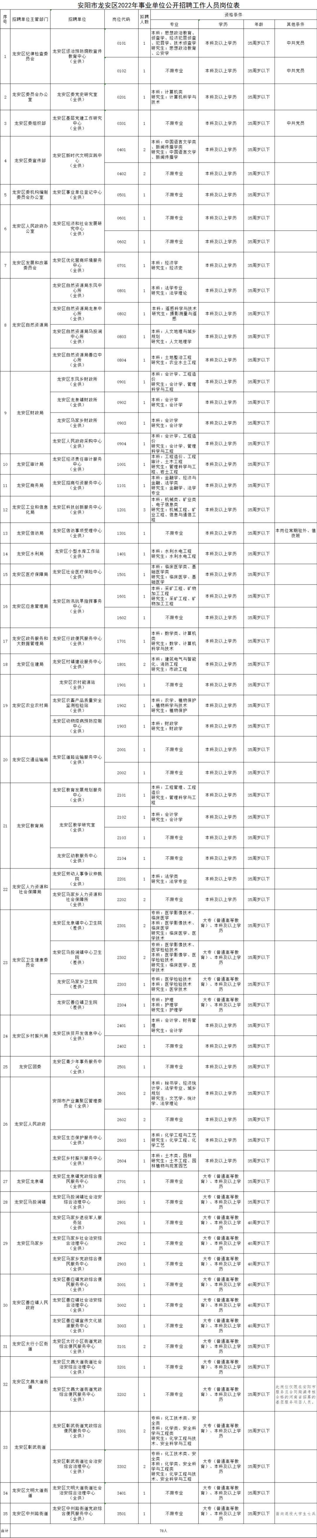 为完善事业单位选人用人机制,新进人员素质,根据《事业单位公开招聘人员暂行规定》(人事部2005年第6号令)、《事业单位人事管理条例》(中华人民共和国国务院令第652号)、《河南省事业单位公开招聘工作规程》(豫人社〔2015〕55号)、《关于进一步加强和改进事业单位公开招聘工作的意见》(豫人社事业〔2016〕4号)等有关政策文件规定,经龙安区委机构编制委员会同意,按照“公开、平等、竞争、择优”的原则,决定为龙安区事业单位面向社会公开招聘工作人员78名。现将有关事项公告如下: