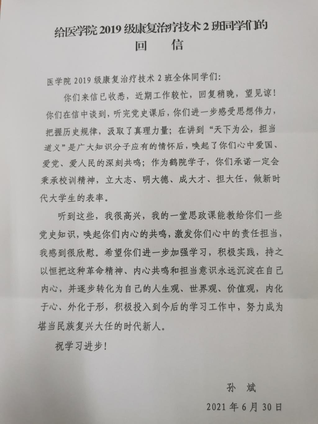 2021年6月30日是医学院2019级康复2班班级群最活跃的一次,他们满怀期待,在即将迎来党百岁生日的伟大时刻,收到了学校党委书记孙斌的亲切回信,这是一份特殊的礼物,同学们感到万分激动。