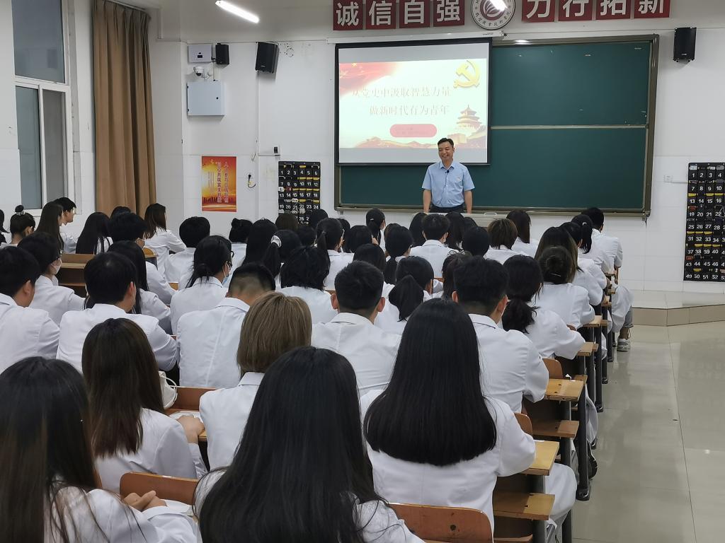 为深入贯彻习近平总书记在党史学习教育动员大会上的重要讲话精神和关于思想政治教育的重要论述精神,落实立德树人根本任务,筑牢高校思政课主阵地,学习贯彻马富国书记5月21日与我校师生代表就党史学习教育进行专题座谈时的讲话精神。学院党委书记孙斌利用5月24日和5月27日两个晚课时间,深入基层走进课堂,为医学院学生上了一堂生动精彩的党史教育专题思政课。医学院党总支书记李宏伟,副书记、院长杨尚玉等旁听课程。